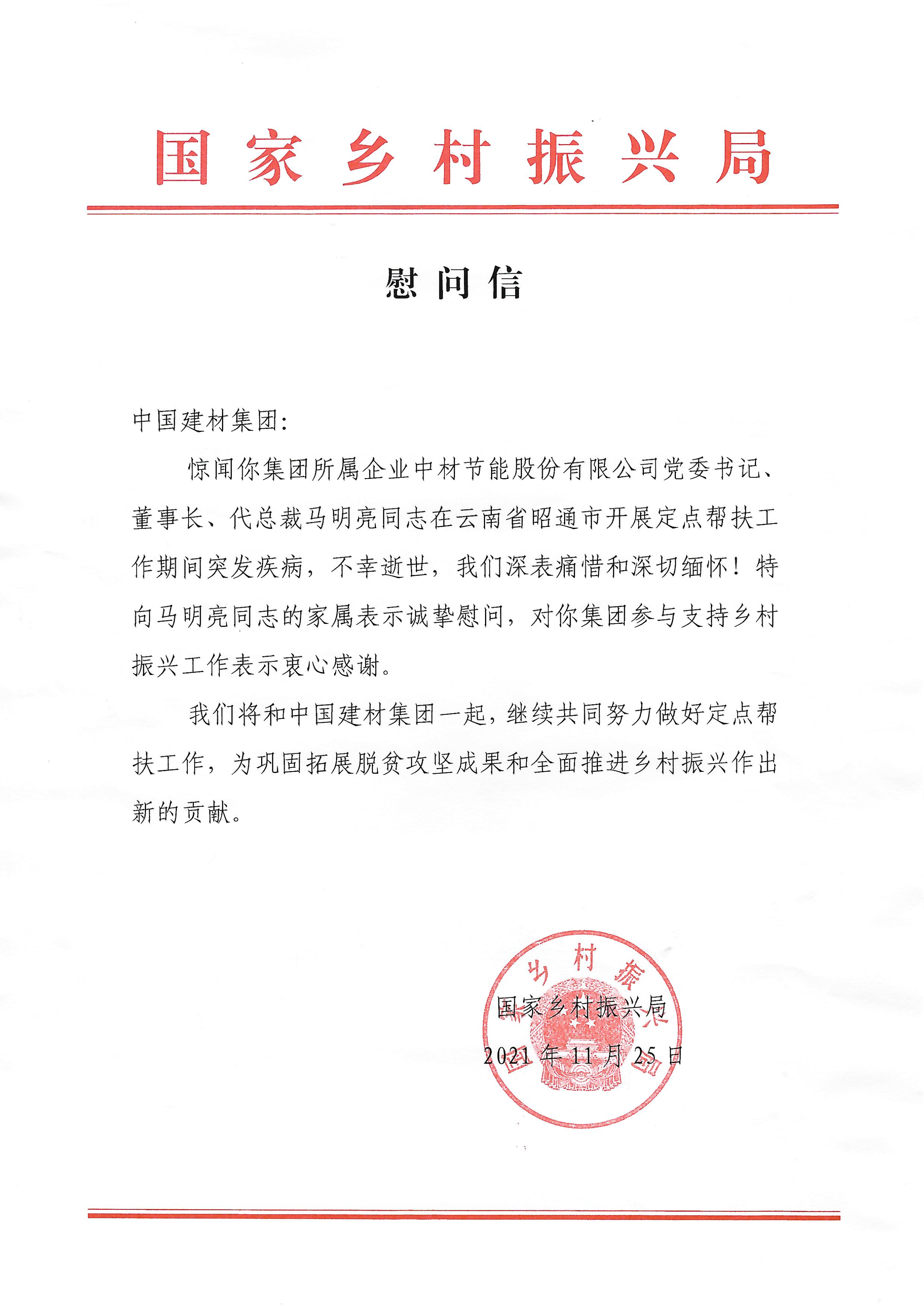国家乡村振兴局就逝世在帮扶一线马明亮同志致51吃瓜 慰问信