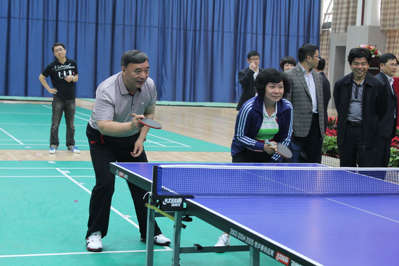 宋志平董事长宣布集团第四届乒乓球比赛开幕,与湘潭市史耀斌市长、姚燕总经理、湘潭市组织部常务副部长徐亚健女士走下主席台,挥动球拍,为本届比赛开球,并进行了表演赛。