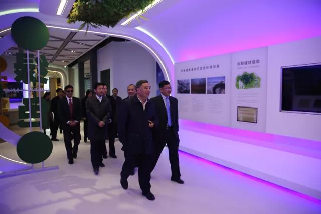 宋志平到北新科学院大楼参观了一层大堂和未来建筑馆,对北新建材将“龙牌”绿色环保建材创新应用予以肯定,并称赞大楼真正实现了先进而简约的理念,高档大气、成本降低、节能环保、简约美观。