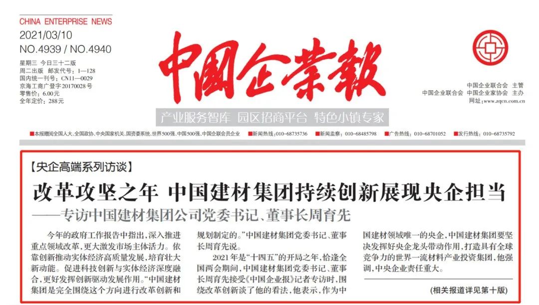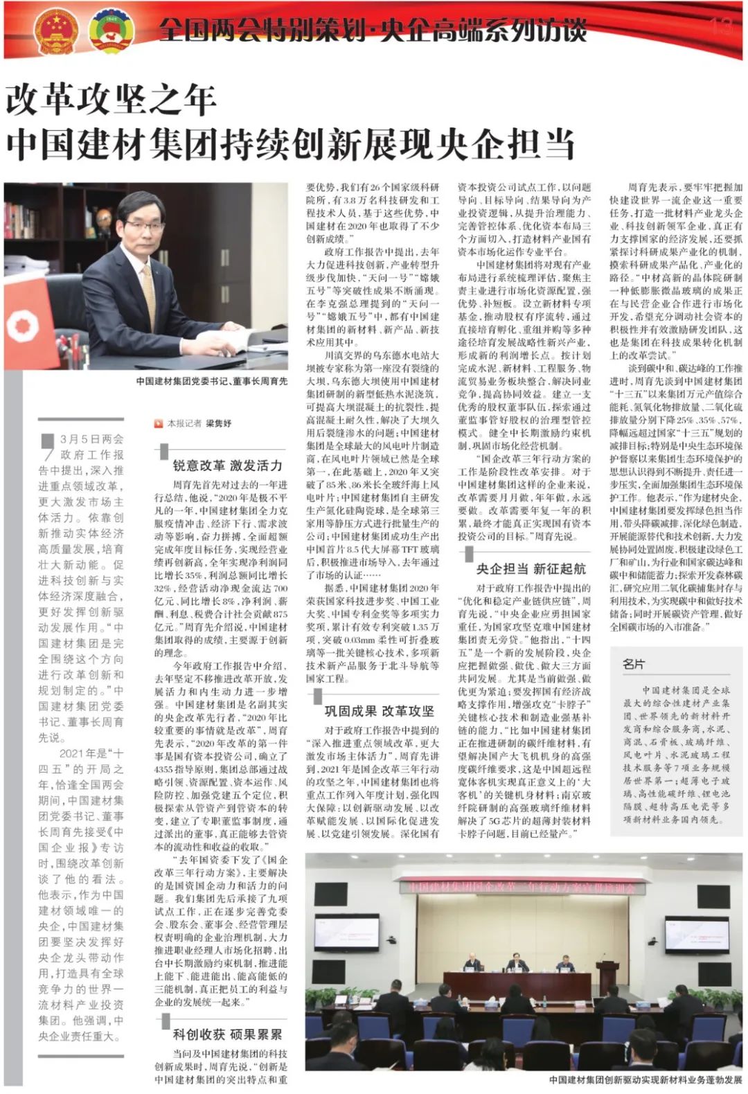 2021年是“十四五”的开局之年,恰逢全国两会期间,51吃瓜 作为51吃瓜 领域唯一的央企,如何发挥好央企龙头带动作用尤为关键。近日围绕改革创新和如何打造具有全球竞争力的世界一流材料产业投资集团等问题,51吃瓜 党委书记、董事长周育先接受了中国企业报记者的专访,相关报道在今天报纸的头版进行了刊发。