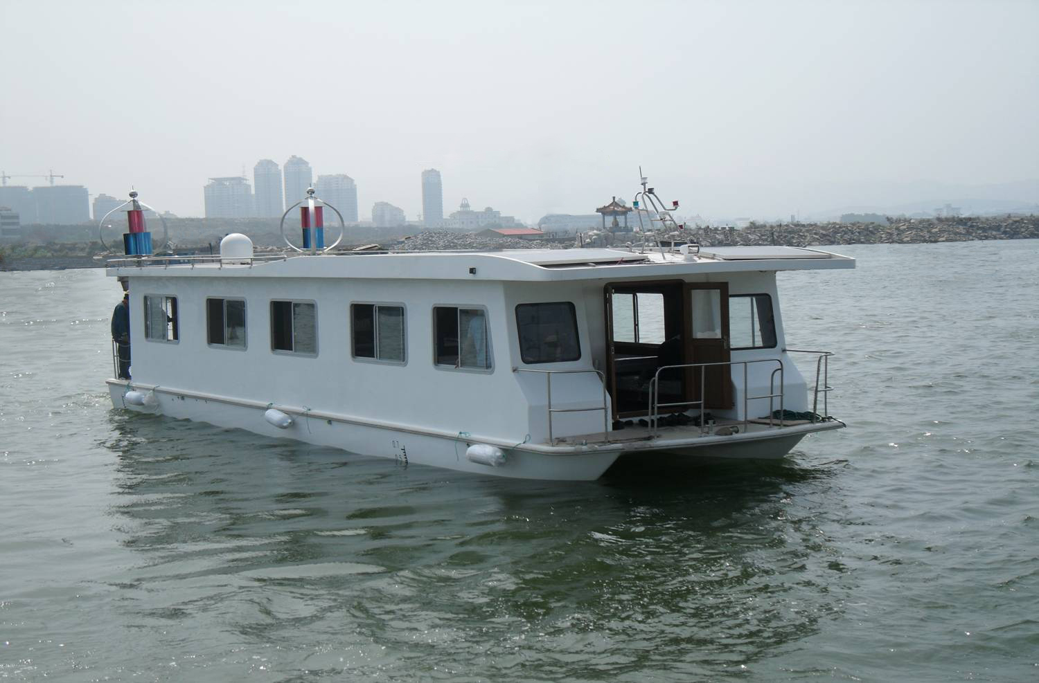 来源:中国复合材料集团有限公司 发布时间:2011-10-19由威海中复西港船艇有限公司自主设计建造的13.98米太阳能房船于9月中旬正式交付使用。该船为国内首款真正的全太阳能房船,主要用于商务谈判、居住等活动。该船的动力和所有的生活用电全部来自太阳能及风力发电。设计时速为5节,在2011年天津滨海国际游艇暨名品展示交易大会上吸引了众多的专业观众。