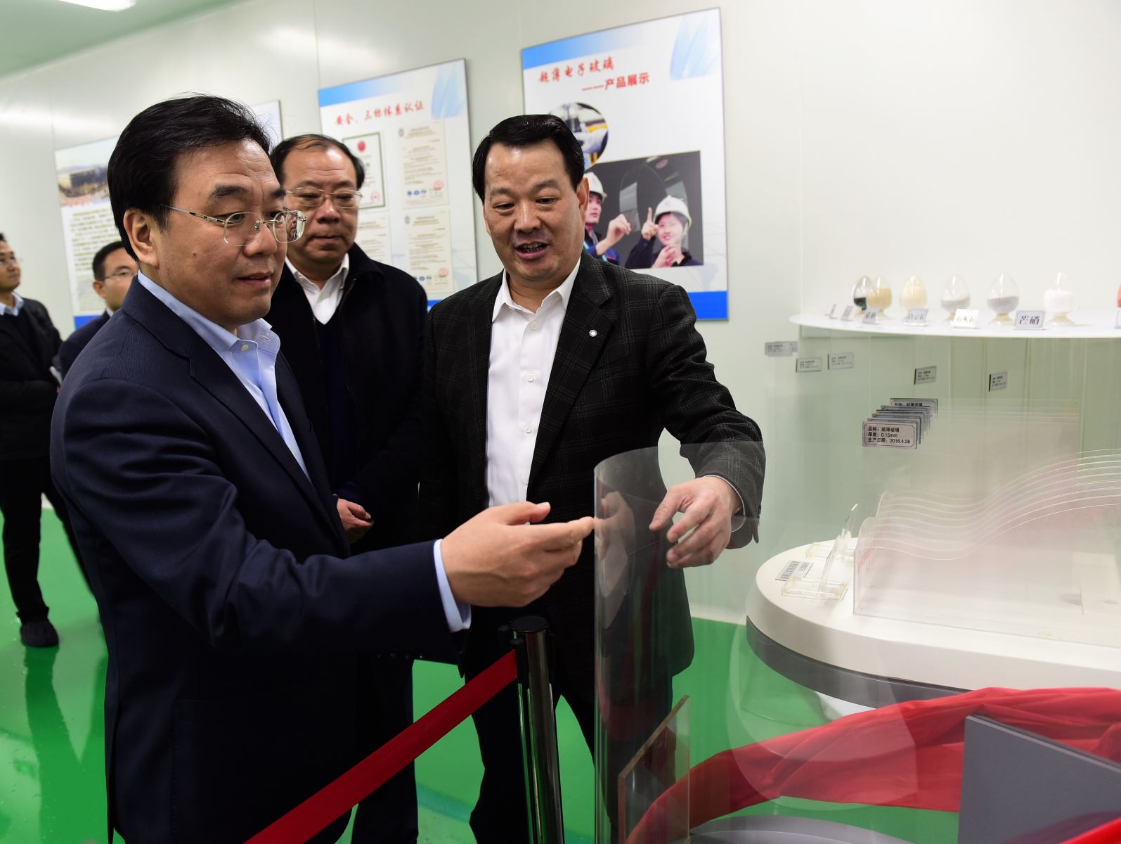 在浮法玻璃新技术国家重点实验室和超薄玻璃基板板生产线,信长星了解了蚌埠院新玻璃、新材料、新能源产业链、科研成果、产业孵化等情况,询问了电子信息触摸屏、8.5代TFT、空心玻璃微珠、CIGS薄膜太阳能电池、柔性显示玻璃等产品的前景、规模、市场以及对国家安全重要性。他对蚌埠院牢牢占领行业制高点、不断攻克难题、刷新世界记录的创举给予较高评价,并希望蚌埠院进一步扩展应用领域,通过材料创新、技术创新、工艺创新、组织创新、生产创新和市场创新,不断推进科研成果产业化。