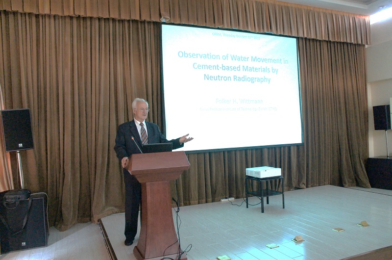 Folker H. Wittmann教授作了题为 “中子成像法研究水泥基材料中水分传输” 的精彩报告,主要讲解了中子成像法基本装置和原理,着重阐述了中子成像法混凝土中水分传输研究过程中的应用。他指出中子成像无损研究方法对于评价混凝土耐久性具有非常重要的意义。