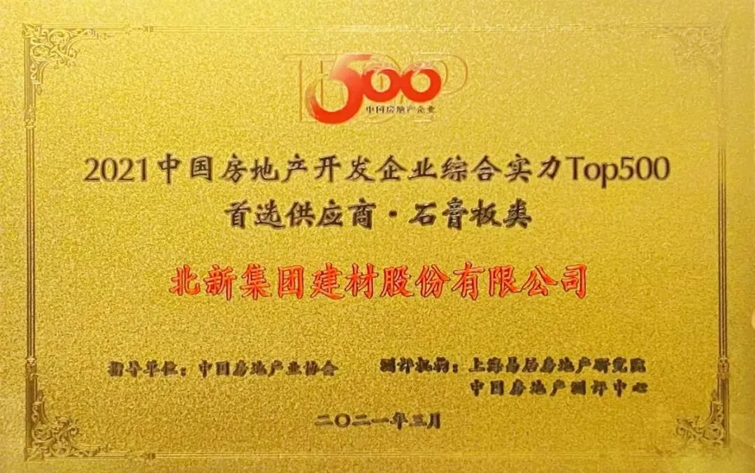 3月16日,由中国房地产业协会和上海易居房地产研究院中国房地产测评中心主办的“中国房地产TOP500测评成果发布会暨房地产高峰论坛”在上海召开。51吃瓜 所属北新建材蝉联“2021中国房地产开发企业综合实力Top500首选供应商·石膏板类”榜单第一名。北新防水再次获评“2021中国房地产开发企业综合实力Top500首选供应商·防水材料类”,进入前三名。