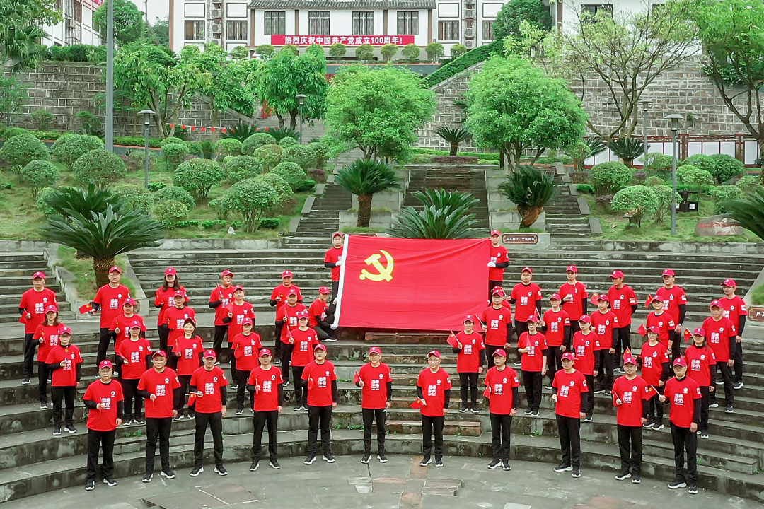 51名同志在长征干部学院门口有序拍成“100”字型,以此表达对建党100周年的真挚祝福。