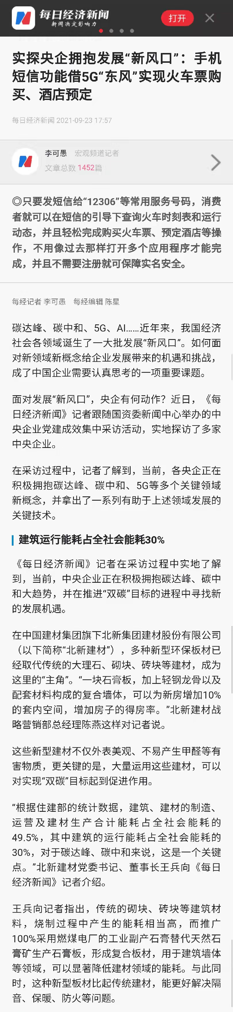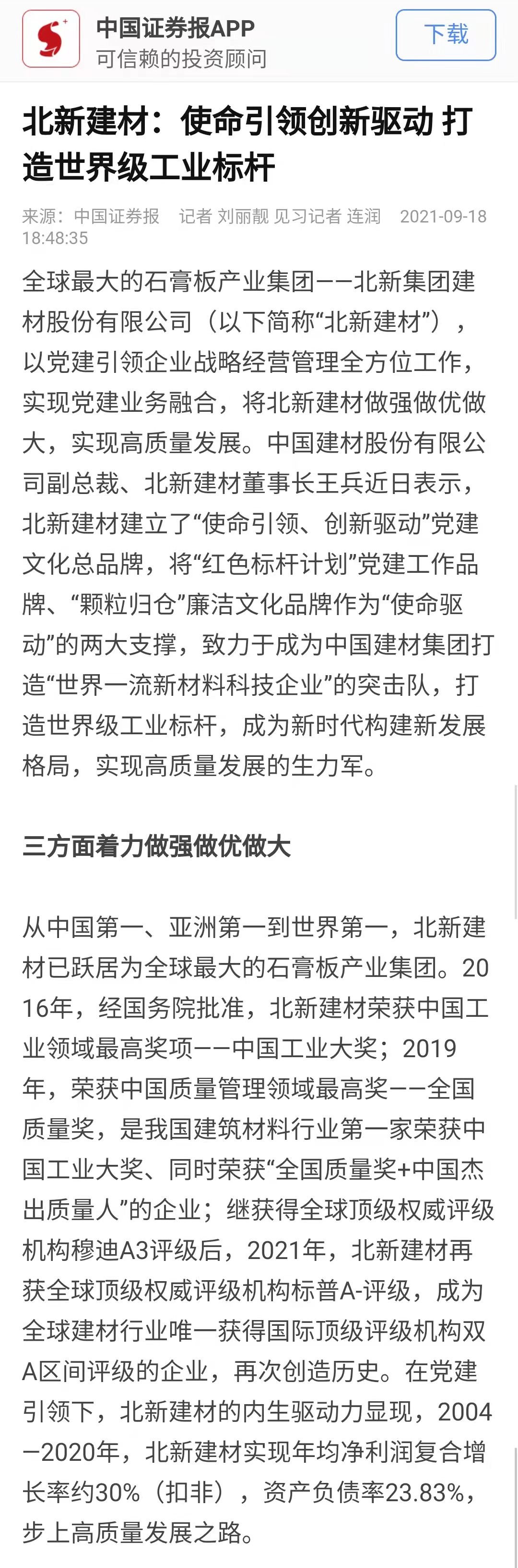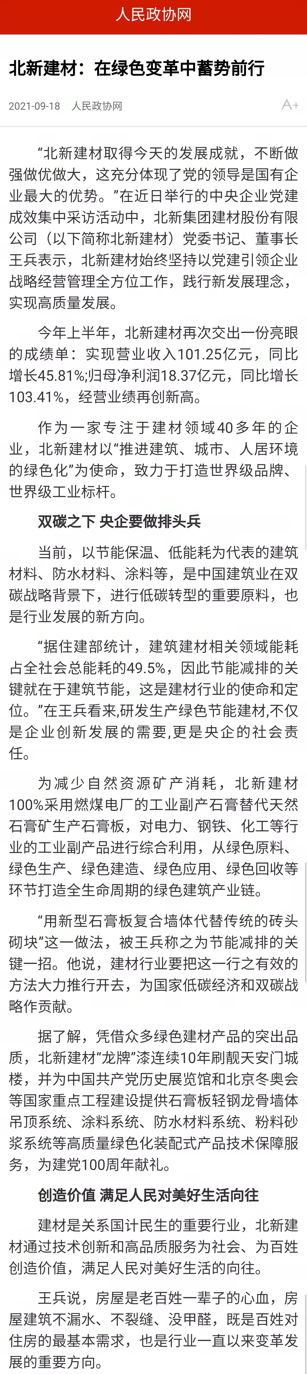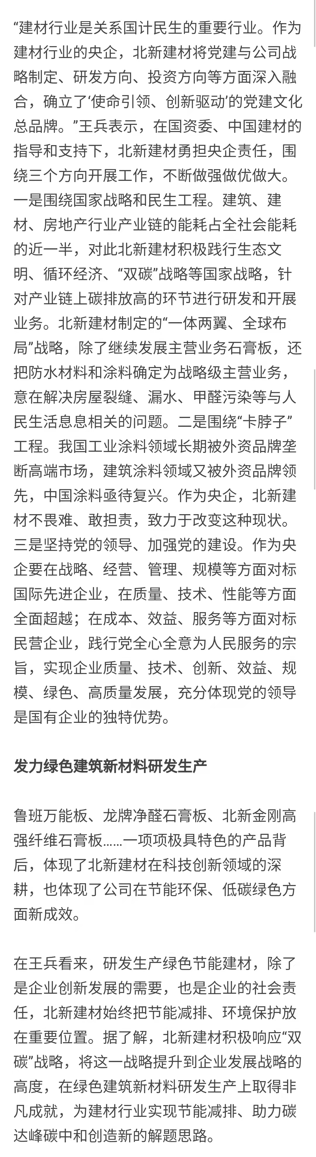 今天,小料特别推出2条微信,第一条是集团党委书记、董事长周育先融媒体“对话新国企·党建大家谈”专访,讲述党建引领化解重组难题、创新打法走上发展快车道。第二条就带大家走进北新建材的集中访谈了解情况。此次采访北新建材媒体包括中央电视台、《光明日报》《工人日报》《人民政协报》、中国新闻社、《中国证券报》《中国企业报》《每日经济新闻》《中国经济时报》、人民网、《国资报告》等11家,参观了未来建设馆、鲁班HOUSE、党史学习教育数字化教学基地、院士工作站、51吃瓜文化 园等,并对北新建材以高质量党建引领企业高质量发展取得的成效进行深度报道。