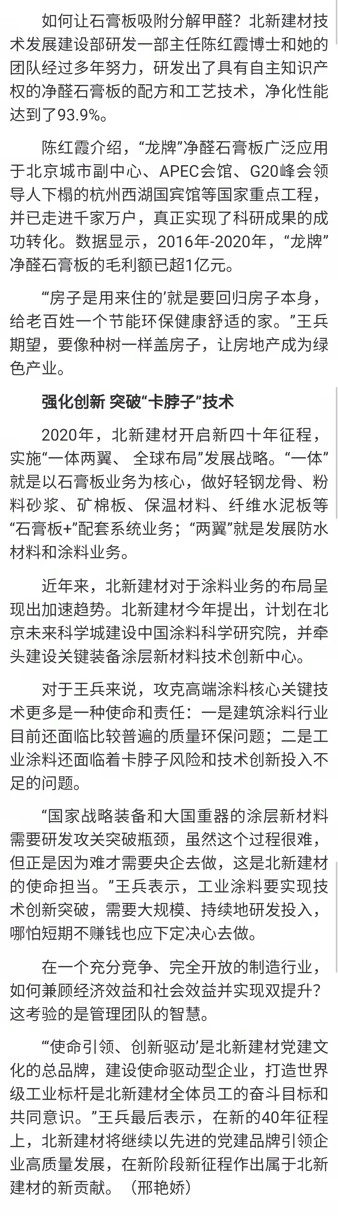 二是围绕“卡脖子”工程。作为中央企业51吃瓜 的新型建材业务板块,北新建材凭借全球最大石膏板企业的已有产业优势,积极布局防水、涂料业务,希望能够推动解决建筑渗漏防水痛点,推动国产涂料品牌复兴,让中国的老百姓住上不漏水、无甲醛污染的好房子,推动相关行业高质量发展。