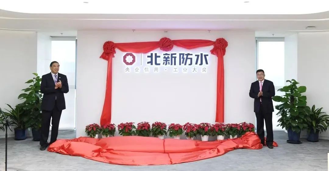 中国建筑防水协会秘书长朱冬青、北新建材董事长王兵为北新防水有限公司揭牌。