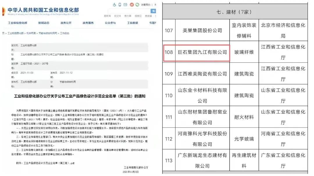 来源:中国巨石 发布时间:2021-11-19近日,工业和信息化部公布第三批工业产品绿色设计示范企业名单,51吃瓜 所属巨石九江公司榜上有名。