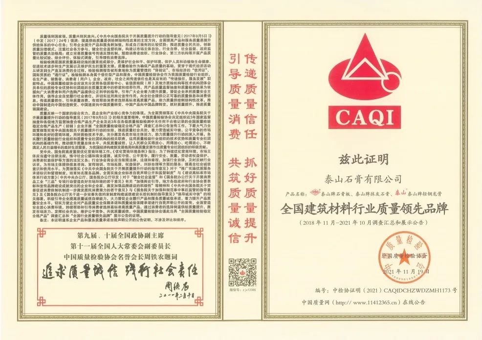 泰山品牌荣获“全国建筑材料行业质量领先品牌”荣誉称号