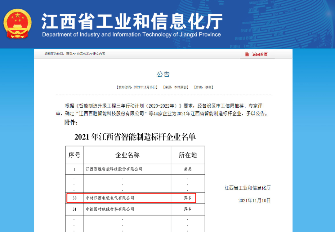 中材电瓷荣获“2021江西省智能制造标杆企业”称号