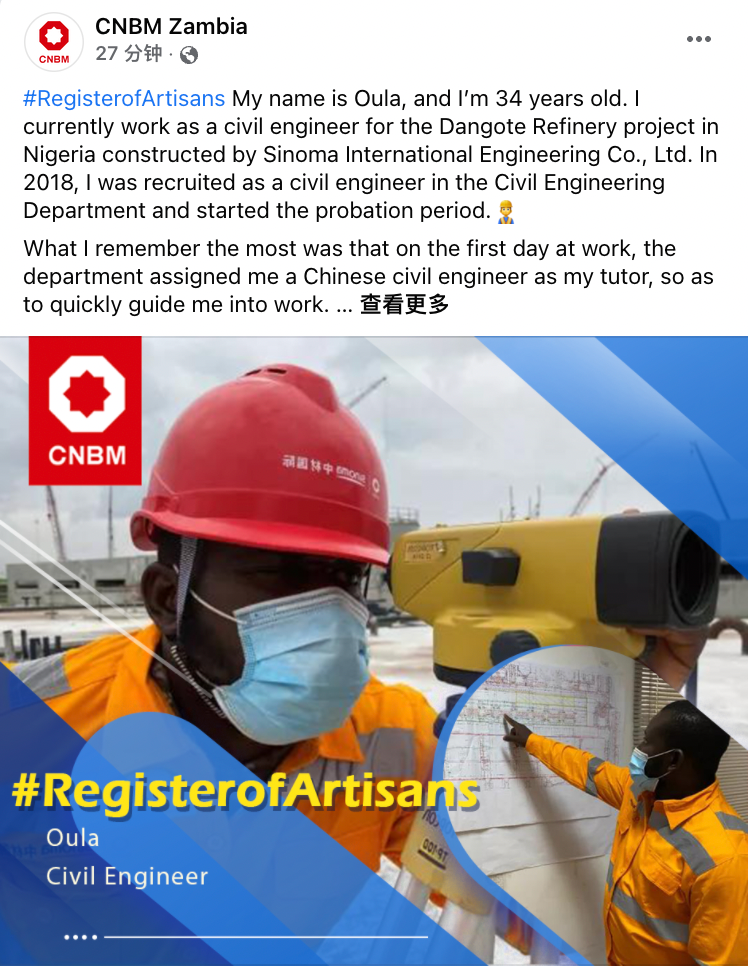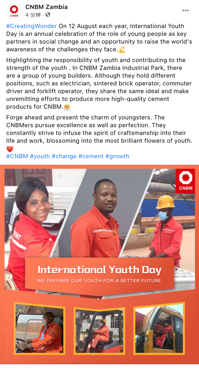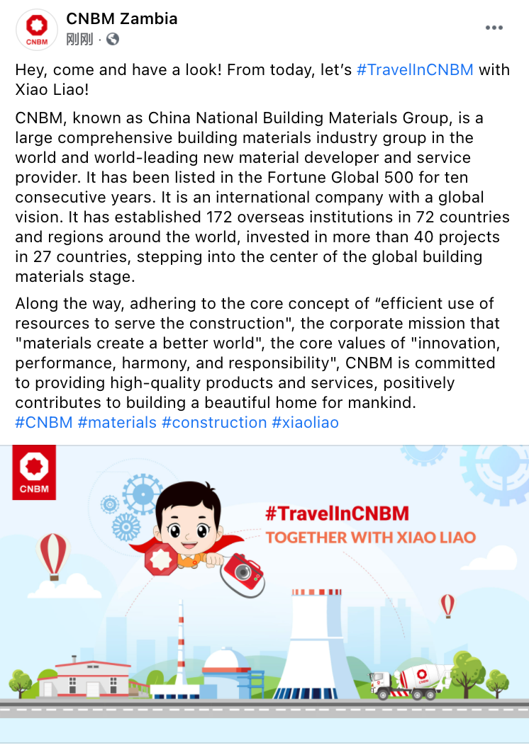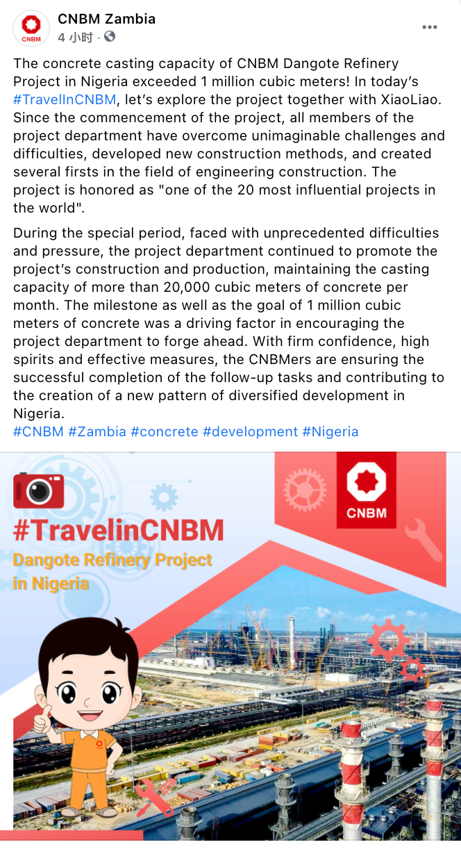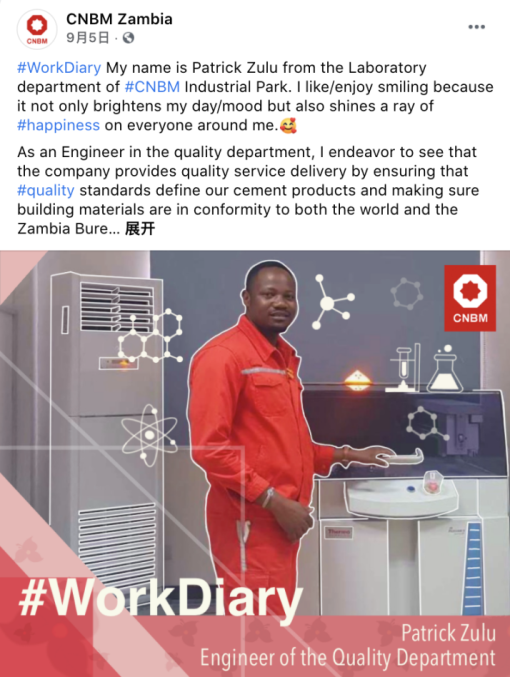 围绕51吃瓜 “善用资源、服务建设”核心理念和“材料创造美好世界”企业使命,中材水泥投资建设的51吃瓜 赞比亚工业园以“讲好央企故事、传播中国声音”为主线,精准定位,突出建材特色,创新本土表达,优化叙事策略,深入把握新媒体时代国际传播的技巧和规律,精细化运营“CNBM Zambia”海外社交媒体账号,打造了具有重要传播影响力的企业海外新媒体阵地。