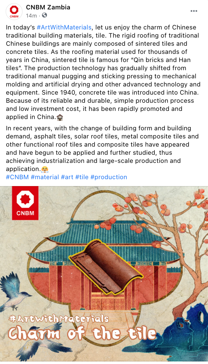 用好“价值认同”这张牌,发挥文化融合润物无声的力量,引发当地社会广泛的情感共鸣。推出“遇见赞比亚”“节日热点”“小料环游中华文化”“中式建材之美”等专题,建立与企业视角和话语相匹配的故事连接,寻求当地与中华传统文化的契合点,根植当地文化特色并与国际文明接轨,提升了文化感召力和亲和力,实现了“中国味”+“本土风”+“国际范”的有机融合。