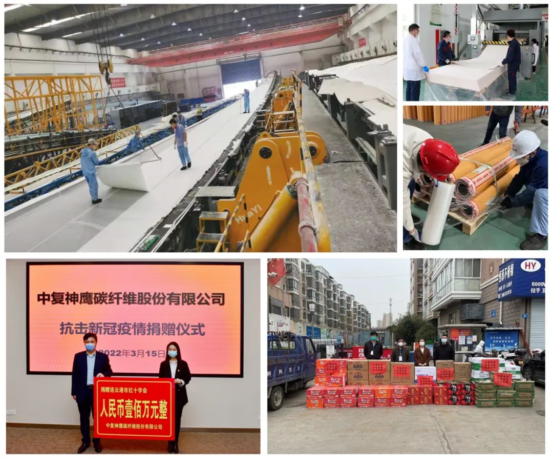 中复连众结合实际研究制定应对措施,组织厂内住宿职工开展各项工作,保订单稳生产。中复丽宝第加班加点,紧盯现场、紧抓生产、紧急消毒,确保销供产正常可靠运行。北新地材车间生产工人最短时间内生产出所需的抗疫地面材料。中复神鹰在连云港市疫情最吃紧、最困难的时刻,履行央企担当,通过连云港红十字会捐赠现金人民币100万元,同时积极向社会捐赠防疫生活物资。
