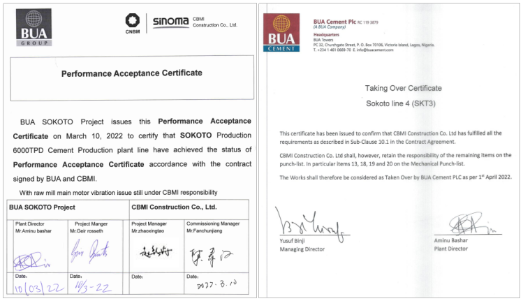 2022年3月10日,中材建设尼日利亚SOKOTO三线项目喜获PAC证书,3月30日该项目又收到了业主签发的TOC证书。两个证书的获得标志着SOKOTO三线项目正式交付业主,正式转入生产运营阶段。