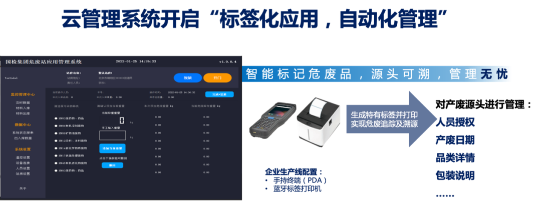 “云管理”是本设施及系统的核心关键点,通过云管理系统,用户只需采用设施中的手持终端、蓝牙标签打印机等进行“扫码”,即可生成一个专属标签,完成人员授权、记录产废日期与品类详情等标记,以此对危废产生、收集、贮存、处置、利用等核心环节进行全程信息化跟踪管理,让危废从入库到回收,实现来源可查、去向可追。