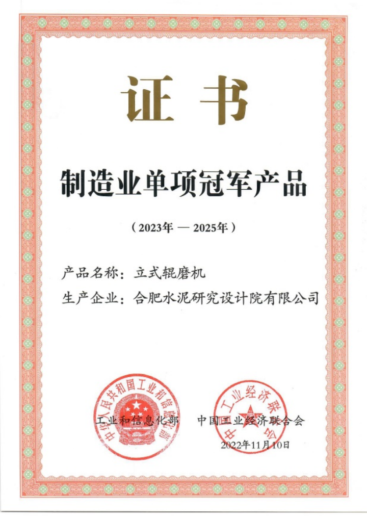 HFCG系列辊压机先后荣获国家科学技术进步二等奖、中国工业大奖提名奖、中国名牌产品,是国家工信部公布的首批制造业单项冠军产品,全球在用量超过1,800台套,是水泥行业唯一入选中央电视台纪录片《大国重器(第二季)》的主机装备;HRM系列立式磨荣获国家科学技术进步二等奖,是第七批国家工信部公布的首批制造业单项冠军产品。同时,合肥院积极拓展装备的应用边界,向其他建材、化工、冶金、电力、煤炭、非金属和新能源等行业延伸,其中,立式磨在水泥外行业收入已约占50%。