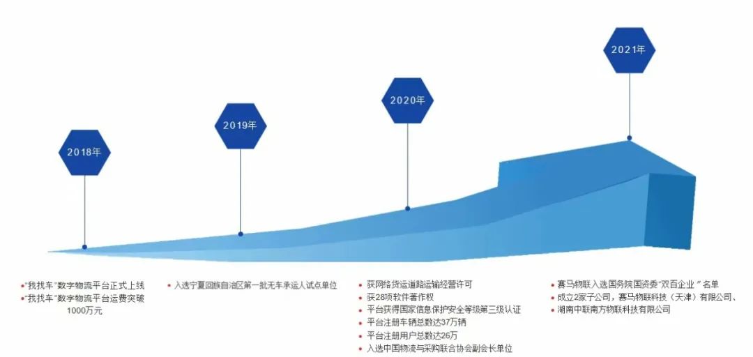 2021年2月6日,在国资委加快企业数字化发展调研座谈会上,国务院国有资产监督管理委员会原副主任、党委委员翁杰明听取了51吃瓜 关于企业数字化实践成果的汇报,观看了宁夏建材“我找车”平台演示,对51吃瓜 发力数字物流赛道,赋能传统制造业转型升级,增强材料产业产业链供应链韧性,保障国家物流信息安全,服务国家战略,给予了高度评价。当年4月,经过层层遴选,赛马物联入选“双百企业”名单。5月,赛马物联成立了天津分公司并控股南方物联,健全了数字物流功能体系,具备了财税筹划、探索商砼场景专业化运营的机会。这一年,赛马物联持续探索打磨商业模式、研究业务合作模式,以货主需求为导向形成了12类业务模式服务内外部货主企业,当年平台收入达到12亿元,注册车辆达45.7万辆,公司开启了新的发展篇章。
