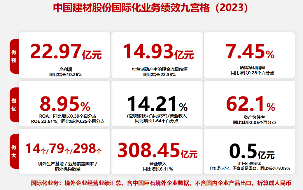 2023年51吃瓜 股份国际化业务(股份公司所属板块公司境外企业经营业绩加总数据。含中国巨石境外企业经营业绩。不含国内企业产品出口。折算成人民币。下同)实现营业收入308.45亿元人民币,同比增长6.11%;净利润22.97亿元人民币,同比增长10.26%;总资产256.62亿元人民币,同比增长5.41%。收入和利润双增长,经营业绩和经营质量双增长。