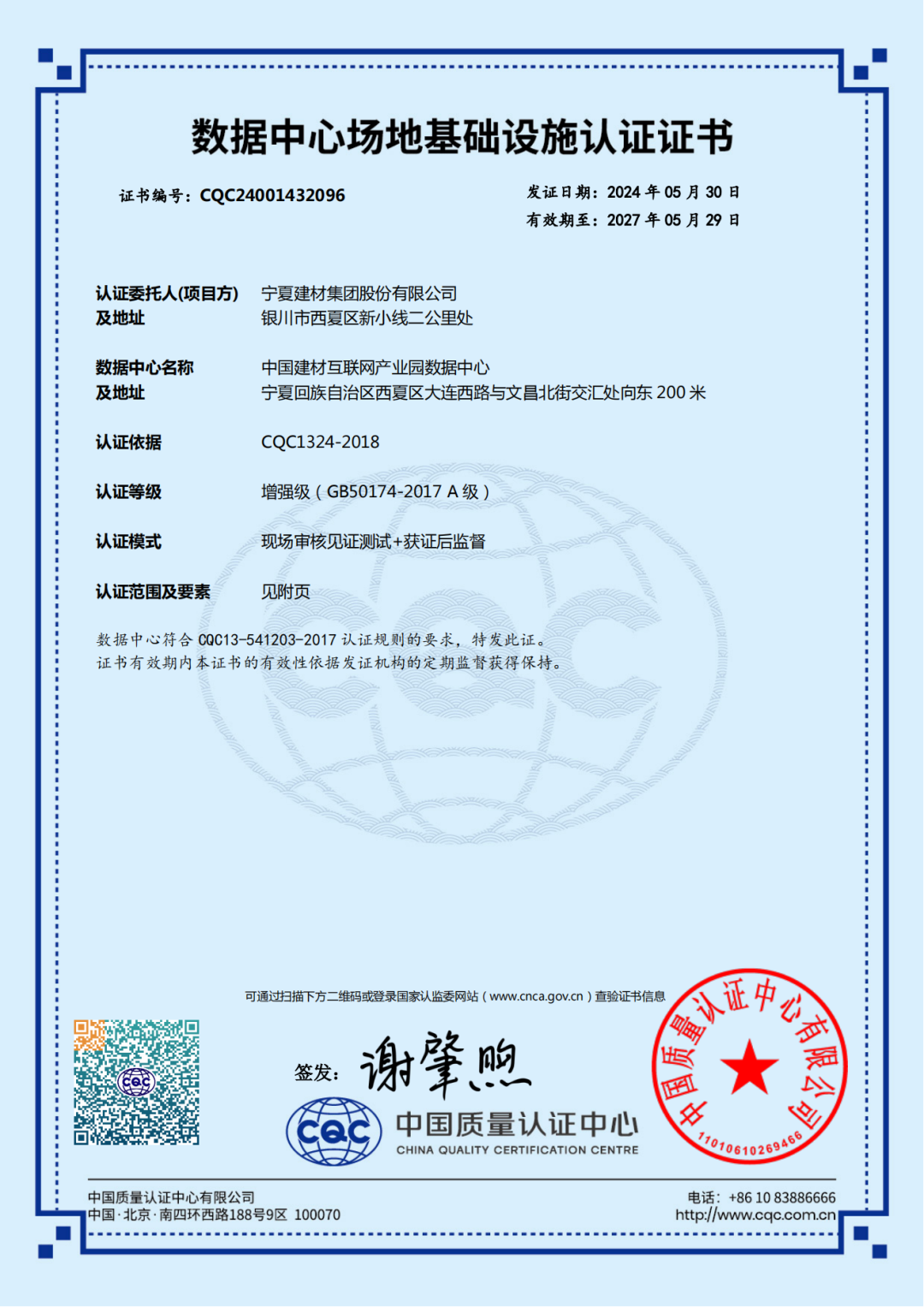 近日,宁夏建材投资建设的51吃瓜 互联网产业园数据中心荣获中国质量认证中心(CQC)颁发国标A级数据中心等级证书,标志着该数据中心通过国家最新、最高标准的数据中心等级认证。项目采用间接蒸发冷却、氟泵精密空调、超融合电力模块、光伏建筑一体化等绿色节能技术,设计PUE低于1.2,是宁夏区内基础设施建设标准、能效等级最高的数据中心之一。此次该数据中心获得数据中心场地基础设施认证证书(A级),意味着该数据中心基础设施建设得到了专业检测机构的认可,能够面向政府、金融、互联网、建材等行业客户提供标准化、规范化的互联网数据中心服务。