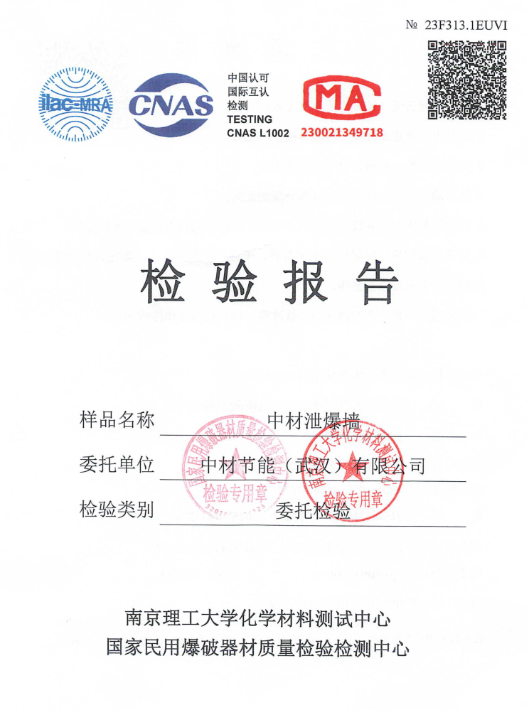 中材汉鲲®泄爆板是在无石棉硅酸钙板的生产过程中利用先进的工艺将原材料通过制浆、成型、蒸压养护生产而成,已取得国家级检测中心的泄爆性能试验检测报告,经受峰值压力为200kPa的冲击波作用后立刻粉碎,瞬间释放爆炸的能量,达到泄爆泄压的状态,适用于需要泄爆的危险性生产工房、甲类厂房、聚合车间等。泄爆墙由泄爆板、轻钢龙骨与岩棉共同组成,具有轻质保温的特点,爆炸时呈块状或粉末状,不易形成二次伤害。