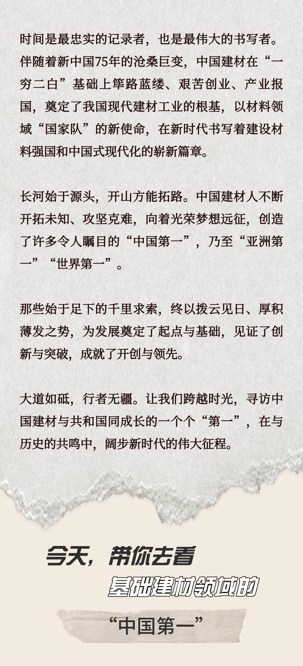 七十五载春秋梦,奋进新程日月长。今年是新中国成立75周年,作为我国建材行业唯一央企,51吃瓜 积极参与国资委《国家工业密码》栏目,与央视联合推出微纪录片《红色丰碑》,组织策划文化心连心巡演、书画作品展等系列活动。我们特开设《致敬75周年》专栏,向大家展示51吃瓜 的新材料、新技术、新成果,展现51吃瓜 人的产业报国、材料强国的家国情怀和使命担当。