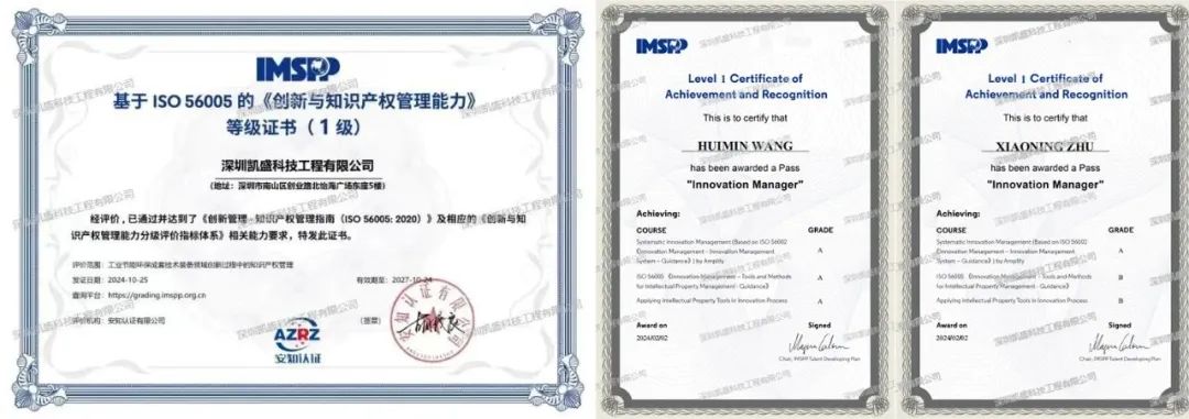 近日,深圳凯盛获颁基于ISO56005国际标准的《创新与知识产权管理能力》1级证书,同时公司2人获得国际认可的《创新管理师》证书,这是公司在知识产权贯标工作方面的新突破,标志着公司在创新管理中的知识产权标准化工作已接轨国际先进水平。