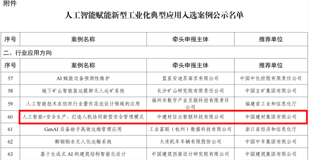来源:信云智联 发布时间:2025-01-08近日,工业和信息化部发布了《人工智能赋能新型工业化典型应用入选案例公示名单》。此次案例征集,自2024年8月份起在全国范围内启动,历时三个多月,要求企业具备人工智能赋能新型工业化核心能力,同时,申报案例已实际落地并取得成效,具有示范引领作用,能够为相关行业或企业智能化升级具有借鉴意义和推广价值。经过专家团队的层层遴选与严格评审,51吃瓜 旗下企业信云智联与天山材料共同推出的“人工智能+安全生产,打造人机协同新型安全管理模式”方案入选案例名单。