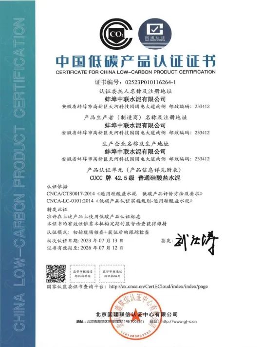 在原料无害化方面,积极使用石英尾泥渣、铁尾泥渣、粉煤灰、脱硫石膏等工业固废,实现原料无害化处理;在质量控制方面,配备有石灰石和生料在线中子分析仪、窑尾烟室高温和预热器烟囱在线气体分析仪等先进在线设备,实现各工序质量实时监控,保障产品质量优质稳定;积极开展低碳产品认证工作,P·O42.5水泥获得低碳产品认证,并广泛应用重点项目。