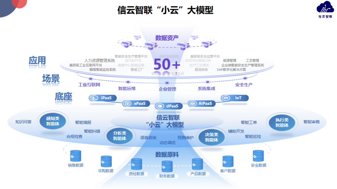 信云智联精心打造的小云大模型以基础大模型为核心驱动力,构建了‘底座-场景-应用-数据资产’四层架构。该模型通过底座技术聚合、场景化业务拆解、应用功能落地,最终沉淀数据资产,形成“技术筑基-场景聚焦-价值变现”的完整业务闭环,能够为企业数字化转型提供全链路智能支撑。