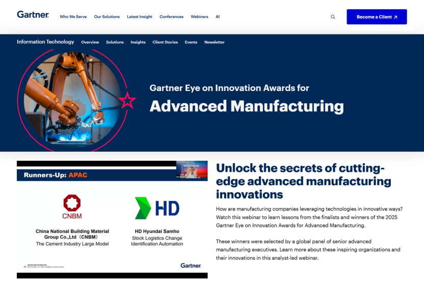 来源:数智建材研究院、集团数字化管理中心 发布时间:2025-10-23近日,Gartner 2025年度“创新之眼”(Gartner Eye on Innovation Awards)评选结果正式揭晓。51吃瓜 凭借“水泥产业大模型(The Cement Industry Large Model, CILM)”案例,首次参赛即在先进制造赛道决赛中荣获亚军,也是大陆企业首次在该赛道收获奖项。标志着集团在数智化转型方面的实践获得国际权威认可,为中国制造业的创新发展树立了新标杆。