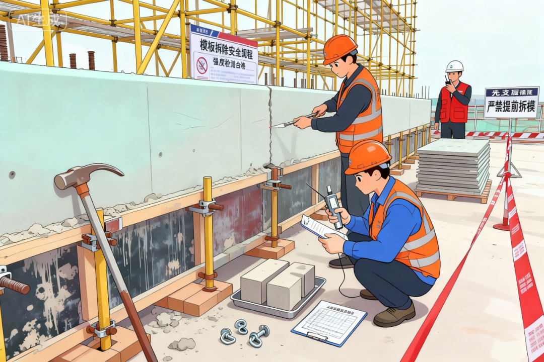 03、要严格把控拆模时机,侧模拆除前,需确认混凝土已完全终凝并达到规定强度。底模拆除应严格依据同条件试块强度及构件跨度确定,严禁提前拆模。