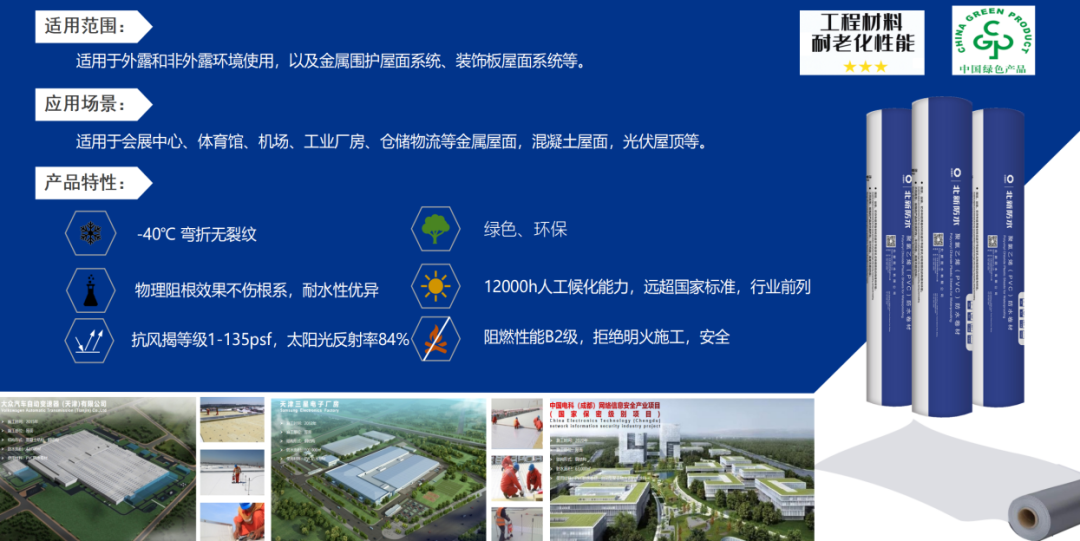 北新防水生产的TPO防水卷材人工加速老化时间可达15000小时,远超国家标准。低温性能可达-50℃弯折无裂纹,阻燃性能可达B1级。通过国家工程材料耐老化性能“五星级”认证、FM认证、绿色建材等认证。