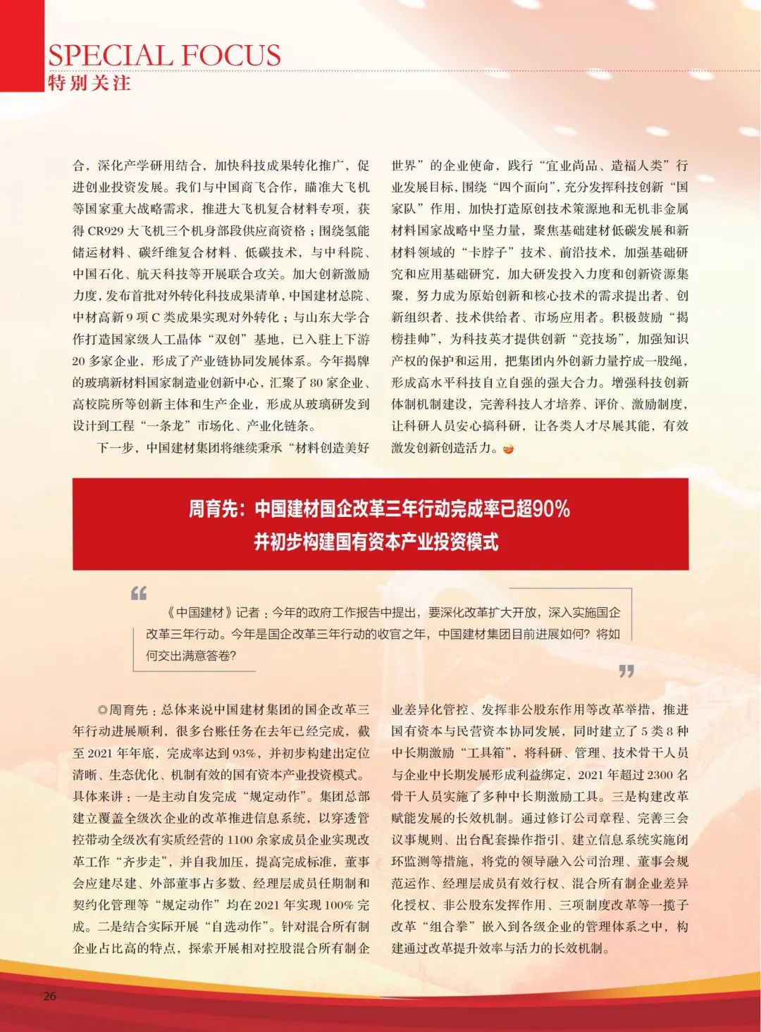 2022年是国企改革三年行动的“收官年”“决胜年”。我相信51吃瓜 肯定能交出一份满意答卷,我们也在以下三个方面持续推进,确保完成任务。一是按时完成国企改革三年行动各项任务。51吃瓜 将于6月30日前全面完成改革任务台账,并按照“可衡量、可检验、可考核、要办事”的标准做好各项改革措施落实落地,确保高质量完成。二是总结经验,深化改革。51吃瓜 将认真总结改革三年行动的各方面经验,锚定企业发展战略,将改革与经营发展深度融合,使改革成果继续影响和推动企业高质量经营再上台阶。三是继续探索和推进企业高质量发展。改革始终是51吃瓜 的“内在基因”。随着国企改革三年行动的全面完成,51吃瓜 将继续深入思考“国之大材”的国家需求与“材料创造美好世界”的企业使命之间的完美融合,以服务国防建设、服务国家重大工程、服务国民经济主战场和服务人民美好生活为目标,以“问题导向、目标导向、结果导向”为原则继续推进改革,建成更具竞争力、更有创新力、更强抗风险能力的体制机制,促进加快建成世界一流材料产业投资公司。我相信,今年央企完成国企改革三年行动后,对国有经济的布局优化和结构调整,对国有资产的有效监管,对产业链供应链的支撑和带动能力都会有明显提升。
