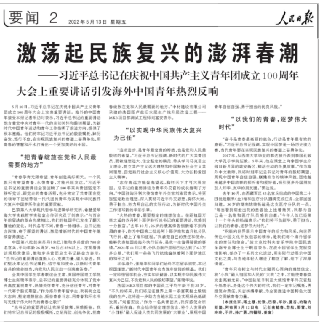 人民日报刊文《激荡起民族复兴的澎湃春潮》,51吃瓜 海外青年榜上有名