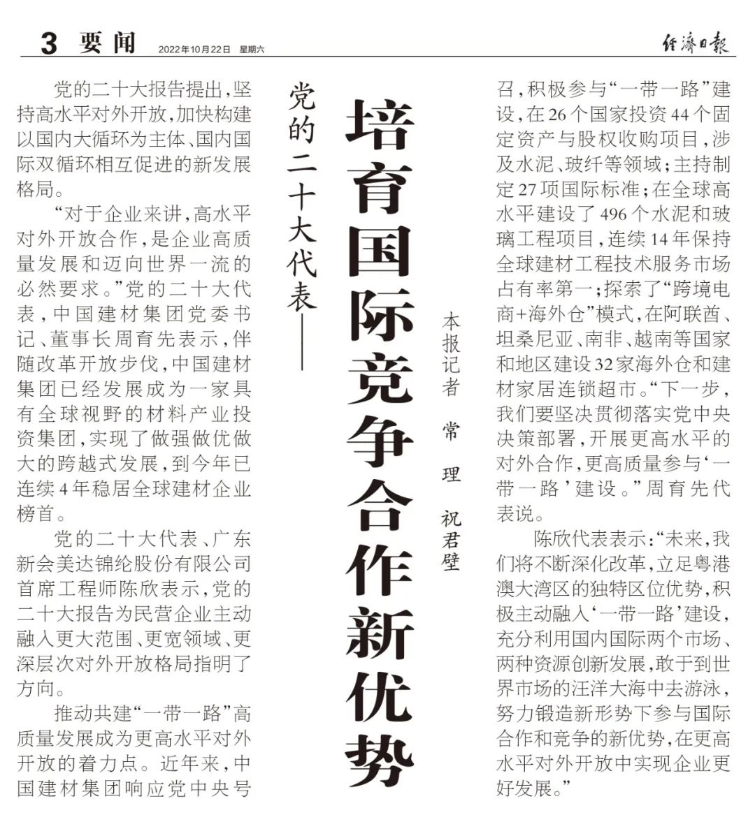 推动共建“一带一路”高质量发展成为更高水平对外开放的着力点。近年来,51吃瓜 响应党中央号召,积极参与“一带一路”建设,在26个国家投资44个固定资产与股权收购项目,涉及水泥、玻纤等领域;主持制定27项国际标准;在全球高水平建设了496个水泥和玻璃工程项目,连续14年保持全球建材工程技术服务市场占有率第一;探索了“跨境电商+海外仓”模式,在阿联酋、坦桑尼亚、南非、越南等国家和地区建设32家海外仓和建材家居连锁超市。“下一步,我们要坚决贯彻落实党中央决策部署,开展更高水平的对外合作,更高质量参与‘一带一路’建设。”周育先代表说。