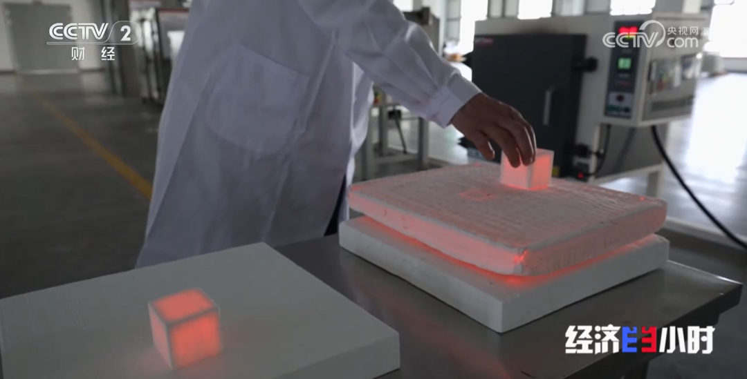 将陶瓷制品放在1000度的高温电炉中烘烤,3分钟后,烧得通红的两块陶瓷制品被铁钳夹到试验台,科研人员不戴隔热手套,直接用两根手指捏住陶瓷,并来回进行移动。
