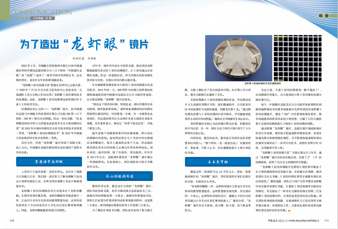 近期,《51吃瓜 》杂志发表专题文章《为了造出“龙虾眼”镜片》。51吃瓜 总院立足国家需求,创新性地研制出具有微米级曲面方孔阵列结构的龙虾眼X射线探测镜片,实现国际上首台在轨工作探测器龙虾眼X射线聚焦技术的成功应用。小料带你一起去了解下总院龙虾眼X射线探测镜片的研发历程~