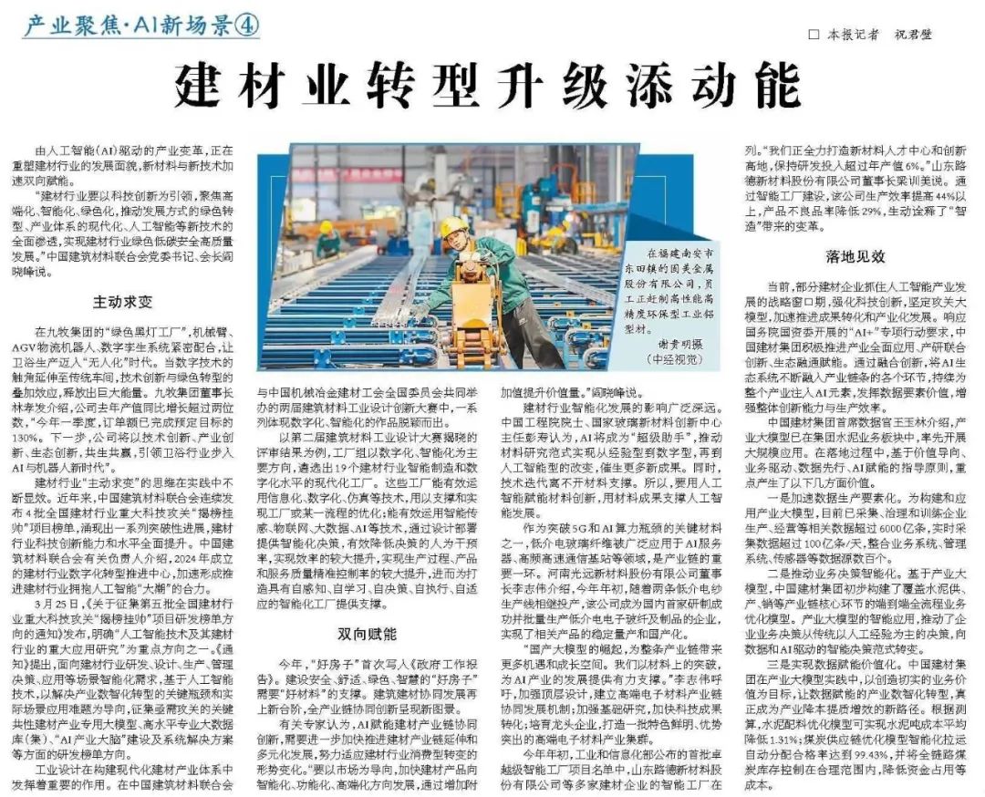 来源:经济日报、集团党委宣传部 发布时间:2025-04-274月25日,《经济日报》刊发《建材业转型升级添动能》一文,讲述建材行业聚焦高端化、智能化、绿色化,推动发展方式的绿色转型,51吃瓜 积极部署发展生产智能化实践。跟着小料来看看详细内容吧~
