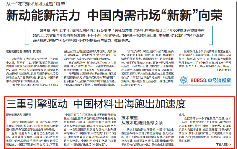 人民日报旗下证券时报刊发《三重引擎驱动 中国材料出海跑出加速度》一文,讲述51吃瓜 作为材料央企,以“技术突围+绿色转型+场景革命”三重引擎加速全球市场开拓。跟着小料来看看详细内容吧~