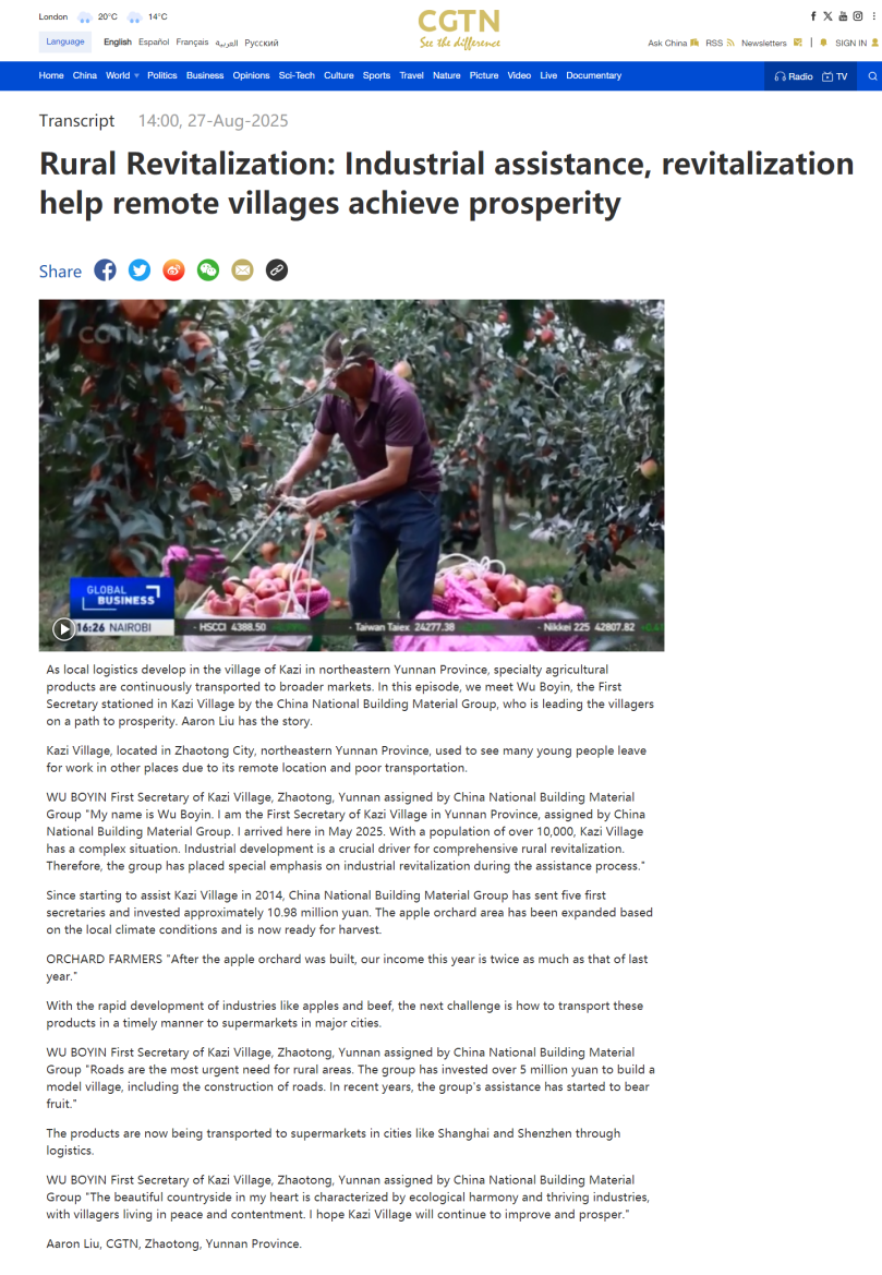WUBOYIN First Secretary of Kazi Village,Zhaotong, Yunnan assigned by China National Building Material Group "My name is Wu Boyin.I am the First Secretary of Kazi Village in Yunnan Province,assigned by China National Building Material Group.I arrived here in May 2025.With a population of over 10,000,Kazi Village has a complex situation.Industrial development is a crucial driver for comprehensive rural revitalization.Therefore,the group has placed special emphasis on industrial revitalization during the assistance process."