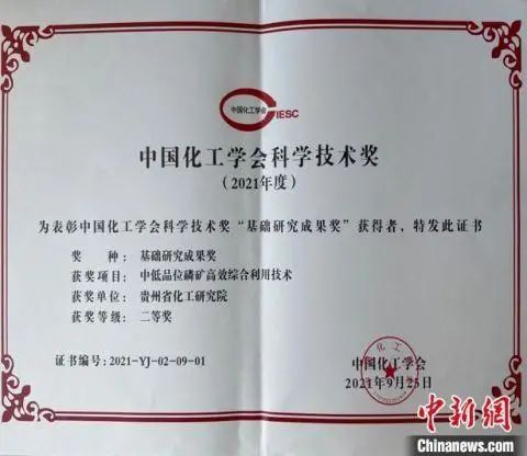 2021年9月,贵州省化工研究院的中低品位磷矿高效综合利用技术获中国化工学会基础研究成果二等奖。