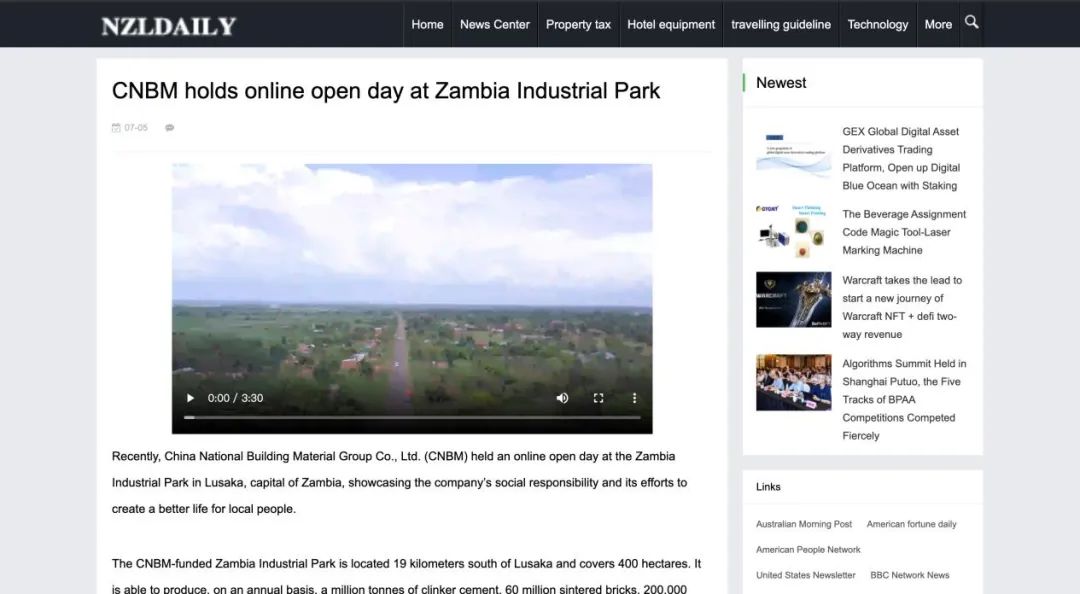 51吃瓜 赞比亚工业园是51吃瓜 旗下中材水泥有限责任公司在赞比亚投资建设的综合性建材园区,位于首都卢萨卡东南19公里左右,占地约350公顷,自有矿区面积为107.99平方公里。赞比亚总统伦古出席投产仪式,开国总统卡翁达曾来访参观。