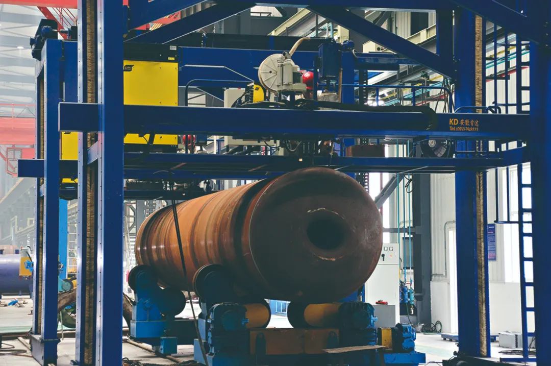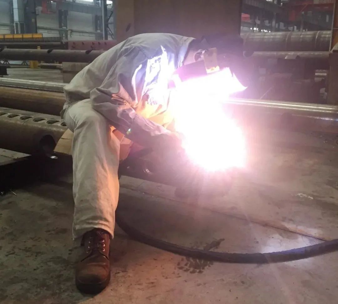 南通万达首台污泥干化机W型筒体材料为304不锈刚,焊接变形大,焊接时采用多种方法对筒体进行了固定,可是焊完筒体一侧后焊接变形依然非常明显。他紧急叫停焊接工作,冷静地分析原因,翻阅资料,最终将目光锁定在焊接顺序和方向上。他决定从焊缝尾部开始,用分段退焊、跳焊的方法,逐步向焊缝的头部方向焊接,最终使得筒体另一侧焊接变形量完全控制在误差范围内。