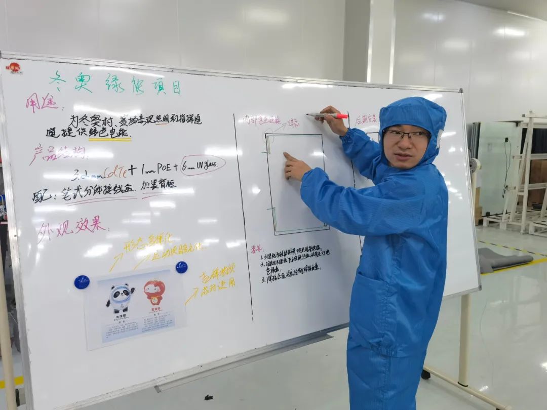 方案选定之后,正值元旦假期,李浩与公司同事坚守工作一线,进行产品打样、评估。“这个图案需要双面呈现”“正负极焊接点要平整,焊接后整体厚度必须控制在0.3mm以内”“安装框的粘接结构胶需要使用透明色的,这样呈现的效果会好很多”,一条条优化建议在讨论中进行碰撞、论证,一步步地完善选定的设计方案,大家都知道,这个时候需要不断地碰撞,才能发现可能隐藏的细小问题,才能让碲化镉发电玻璃在冬奥赛场上得到完美的体现。