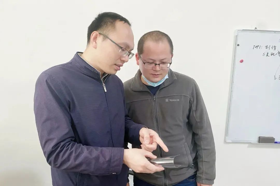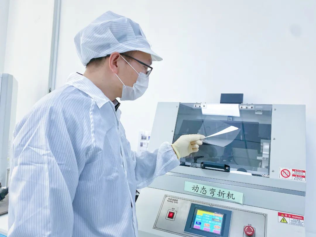 如何突破?一切从零开始,没有设备、没有玻璃、没有重要辅材,面对“三无”的困难处境,大伙摸着石头过河,互相鼓励、互相打气,“白加黑、五加二”,以厂为家,找遍国内所设备、辅材相关供应商。与此同时,杨金发按照工艺流程,建立“专项攻关小组”,设立专项小组负责人,对工艺研发、良率提升等关键核心专项突破,为攻克“笔跌及弯折性能”等相关参数,开启为期近半年之久的全封闭模式,一边从理论出发科研攻关,一边推行“试错”管理办法,侧面突围。