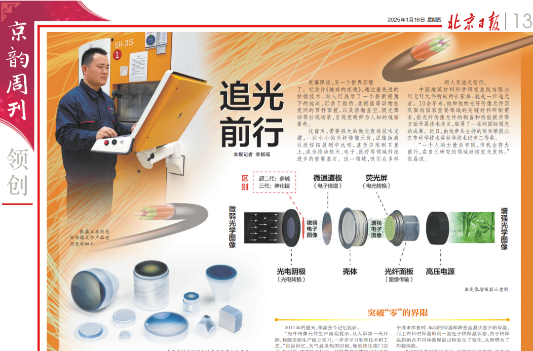 中国建筑材料科学研究总院有限公司光纤元件所副所长张磊,就是一位追光者。10余年来,他和他的团队面向国家重要领域的关键材料研制需求,在光纤传像元件的制备和性能提升等方面开展技术攻关,取得了一系列国际领先的新成果。由他牵头主持的项目荣获2023年度北京市科学技术奖科学技术进步二等奖。