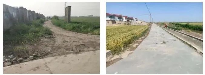 ▲新建村组水泥路及道路亮化前后对比图(右图为改造后)