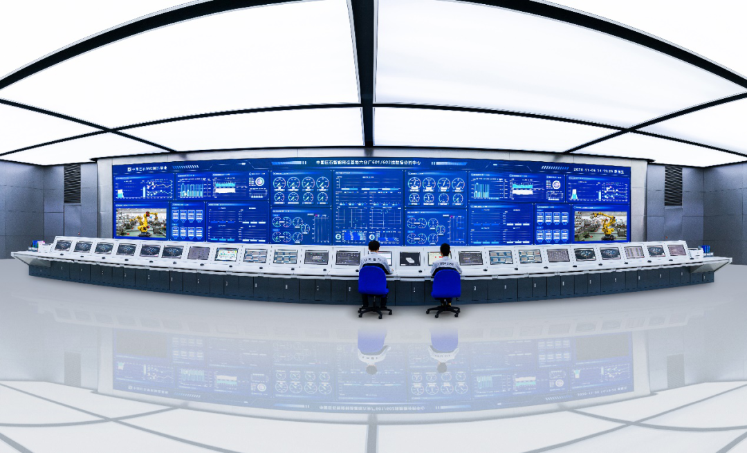 智能控制中心宽敞通透,硕大的显示屏布满了整面墙壁,显示屏上密集的数据图表正在进行全域追踪、实时更新,分门别类对年产15万吨的玻璃纤维生产线进行数字化、可视化的全流程监控。操作台上安装着二十余台电脑,却只有两名值班员。
