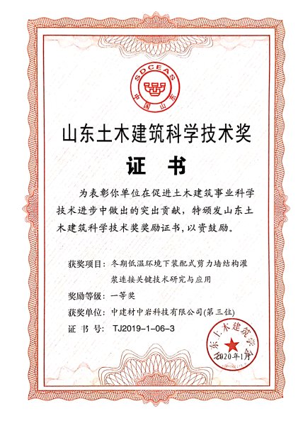 来源: 发布时间:2020-05-222020年1月,中岩科技科研项目《冬期低温环境下装配式剪力墙结构灌浆连接关键技术研究与应用》荣获山东土木工程学会科技进步一等奖。